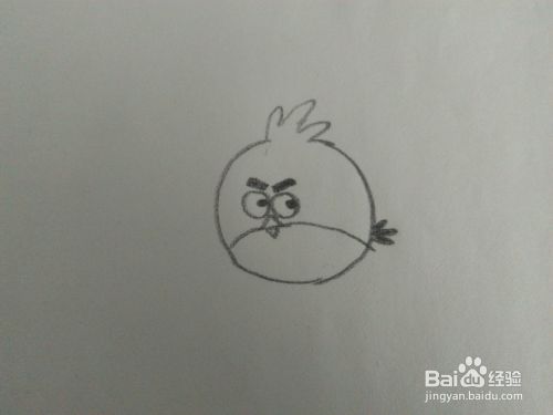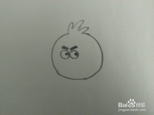 我们在画一只愤怒的小鸟,先画一个圆形,上边留出画鸟毛的地方。把它特有的黑眉毛和大眼表现出来。