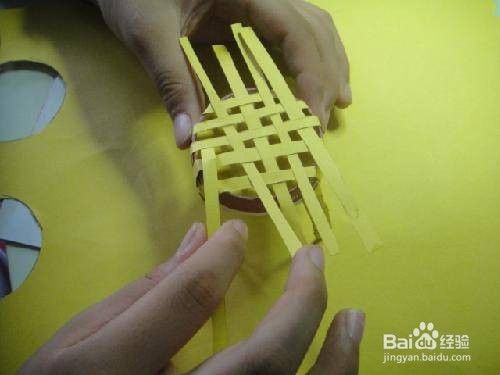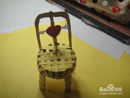 把剪好的纸条横向绷在椅子上,在反面把多余的纸条粘好。再用其余的纸条竖向穿入,使两组纸条呈十字交叉.把剪好的纸条缠在椅子上,做出藤编的效果.