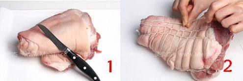 2将猪肘上的肉裹在皮内,用棉绳扎好(这是酱肘子不肉碎脱皮的秘诀,一定要仔细扎好,任肘子在锅内翻滚也不会出现皮脱肉碎的现象了)