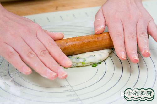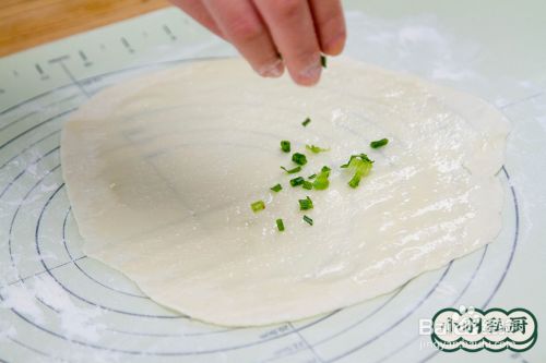 在擀好的面团上刷上一层油,撒上盐和切碎的青葱。