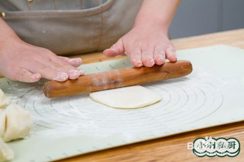 取出醒脑面团,放在撒有干粉的硅胶垫上。揉几次,分为8个小剂型。服一剂,用擀面杖擀。卷得越薄越好。