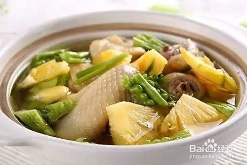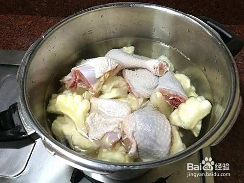 锅中下入鸡块、凤梨、苦瓜、适量清水,中小火炖煮一小时