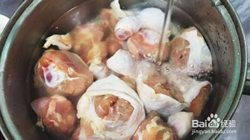 锅中烧水,下入剁好的鸡块,撇血沫清洗干净
