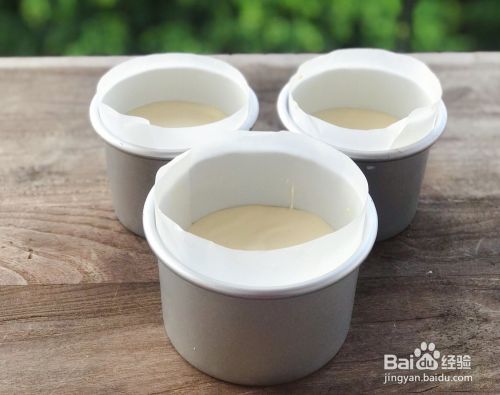 将油纸放入模具中,将混合好的蛋糕糊倒入模具1/2处。