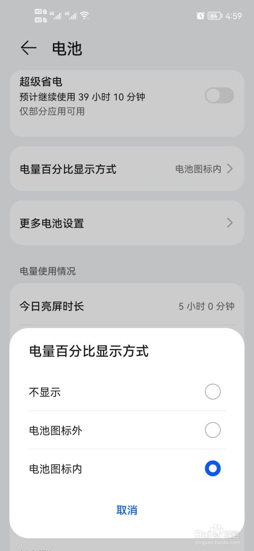 点击【电池图标外】或【电池图标内】,手机上方的电量显示就会出现百分比数字显示。