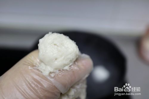戴上一次性手套,手里握一把鱼肉,从虎口处挤出一个鱼丸;