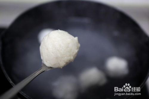 再用一把勺子把丸子舀下来,这样丸子的底部就是圆的了;