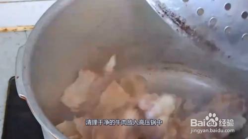 清理干净的牛肉放入高压锅中,往锅中加入适量的温水,大火炖2个小时左右。