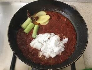 煎鱼剩的油把番茄酱炒一下,然后把葱姜八角糖放入,盐味精加入,倒入料酒,稍微炒一下,放入热水,煮开,能淹没过鱼就可以了