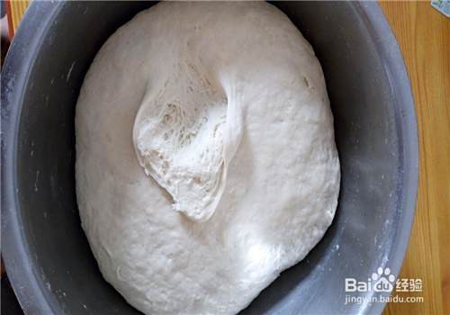 当面团膨大后扒开一点看到里面蜂窝状的小眼,就说明面发好了,就可以把面团放至面板上揉面 了。