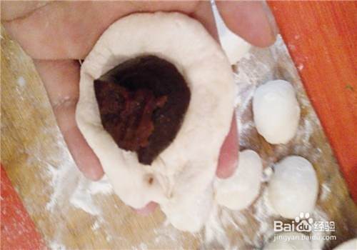 揉好的面,揪成大小均匀的小剂子,比平时蒸馒头要,把小剂子也揉成圆的,然后用手在小剂子捏出一个空心来,中间放入豆沙馅,不要放太多,像包包子那样把豆沙包起来。