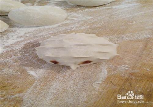包好后,把捏口的一面朝下放,从上面 用拇指和食指捏成一小撮一小撮的像是小刺猬的刺一样。