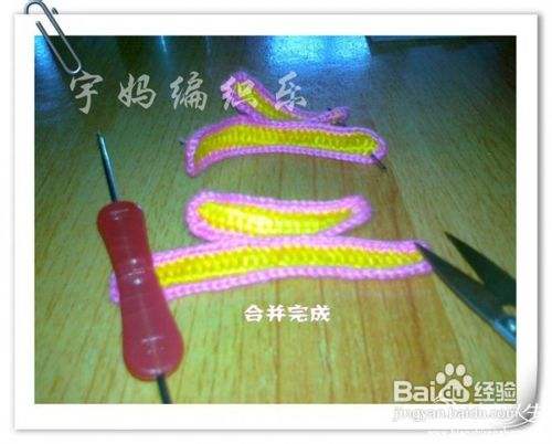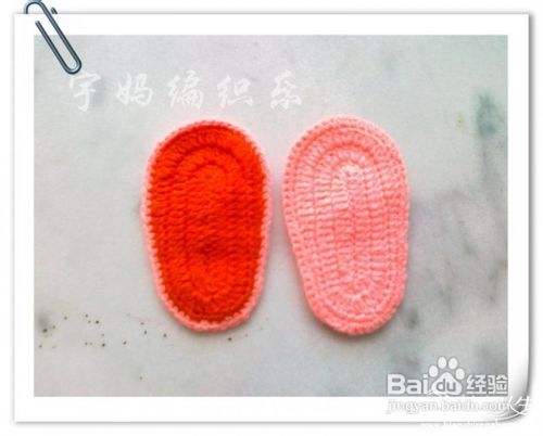 1首先是根据鞋底图解钩好4片同样大小的鞋底,然后将2片鞋底用短针合并在一起: