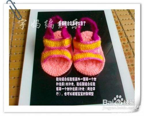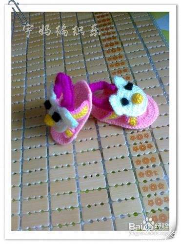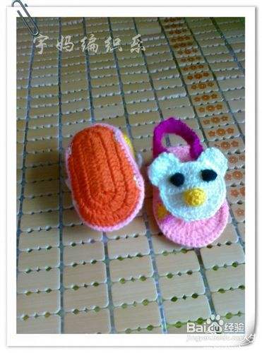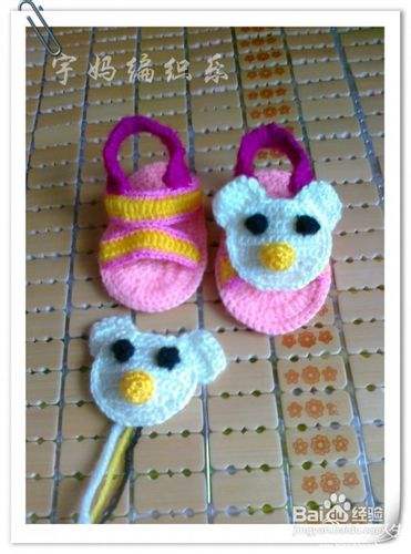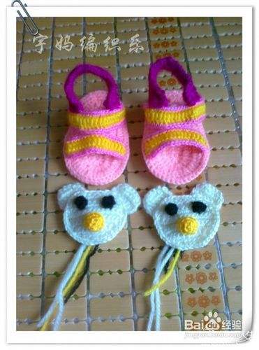 5其实将鞋面与鞋底缝合好后就已经是一双成品凉鞋了,宝宝就已经可以穿了,不过我还钩了一只小熊缝在鞋面上。由于没有纽扣作为小熊的眼睛,我只好钩了一对眼睛,缺少光泽。我钩的小熊好像很像小猪似的,姐妹们可以根据小熊的图解钩一对小熊,然后用针缝合在鞋面上就可以了。    END END