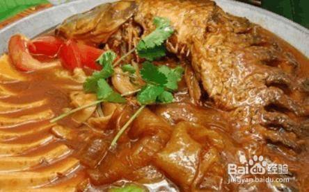 猪皮豆腐炖鲤鱼 原料:鲤鱼350克、北豆腐250克、猪肉皮150克、青椒10克、盐5克、味精3克、酱油5克、醋4克、料酒6克、香菜5克、辣椒(红,尖,干)20克、植物油25克、大葱10克,姜5克