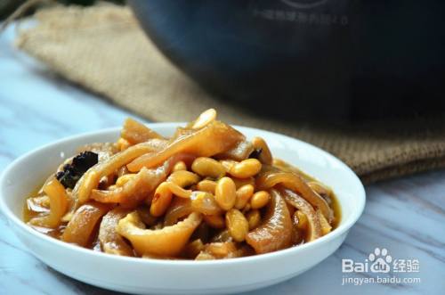 猪皮炖黄豆 原料:黄豆、猪皮、花生、八角、姜、盐、料酒