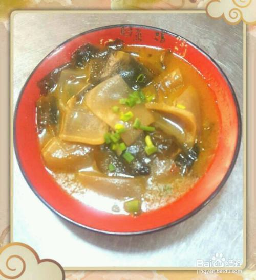 猪皮炖海带 原料:猪肉皮250克、干海带40克、油、盐、蚝油、大葱、大蒜、料酒、花椒、大料、白糖适量