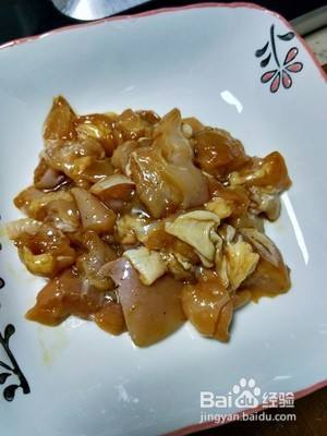 锅内放少许油,把腌好的鸡腿肉倒入翻炒