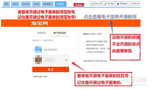 店铺添加完成后会自动跳转到软件内,第一次使用还需要进行菜鸟电子面单的授权。 如您已经有淘宝能打印电子面单,请直接登录那个淘宝旺旺即可,