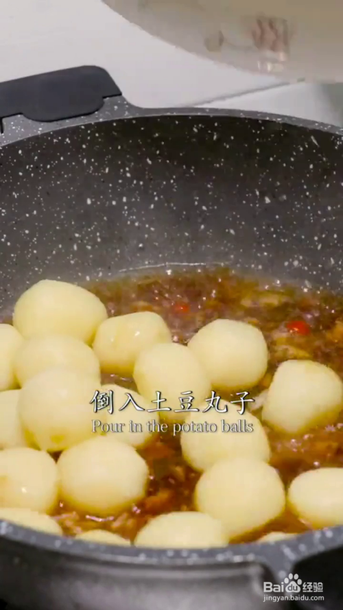 大火烧开后放入土豆球,翻炒至收汁后撒上葱花即可开吃了