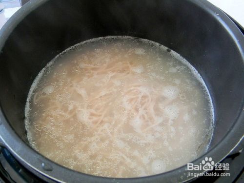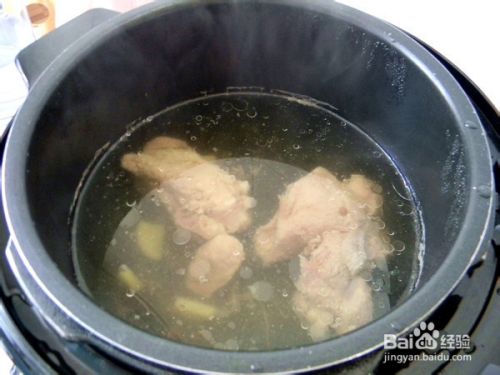带骨猪肉大约1000克,多放水,加调料煮成汤。我用压力锅操作的,因为主要是喝汤,所以要冷水下入肉块,放入姜,八角和胡椒粒以及盐,盖好,煮压10分钟即可,自然放汽后开盖,肉汤备用