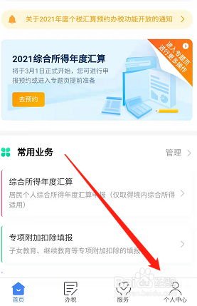 打开个人所得税软件后,我们在首页点击进入个人中心;