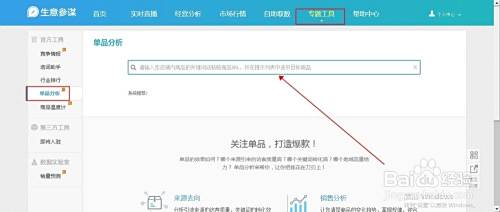 点击生意参谋中的专题工具,再找到单品分析按钮点击。将你要查的拿个宝贝的标题或者URL(网址)复制粘贴到搜索框