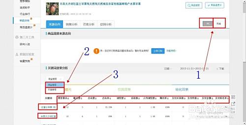 搜索后的页面会提示PC/无线端,你可以根据你的需求找到相应端口。在PC/无线端下有分别分为淘宝端/天猫端的关键词,当然淘宝C店就不用看天猫端了。接下来,你就可以看到关键词及相关数据了,比如曝光/访客/点击/转化/成交金额/关键词排名。当然,在这里,你也可以根据您想要的某一天进行筛选分析,在右上角有时间选项,一般只需要看最近7天的词。