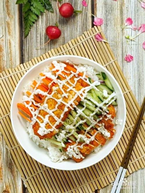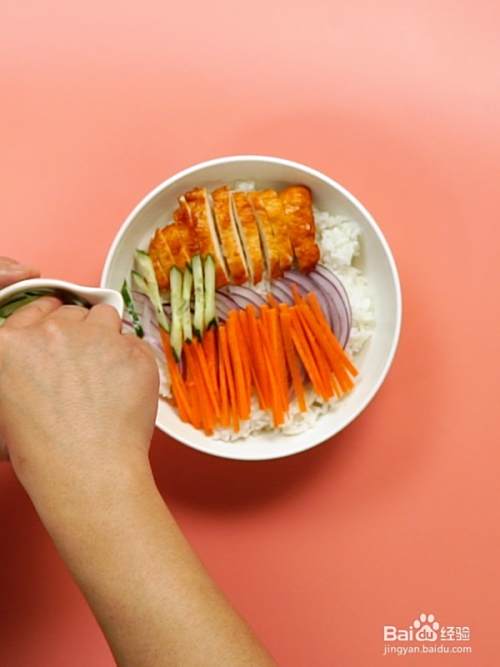 鸡胸肉切条,放置在300克米饭上,摆上黄瓜、胡萝卜、洋葱,放适量沙拉酱即可