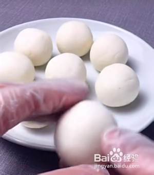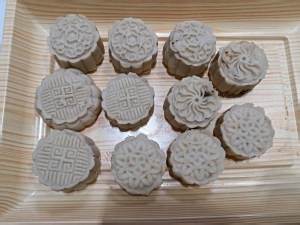 将剂子按成圆饼,把红枣泥包进去,收口,搓成圆球,放入月饼模具中压花。