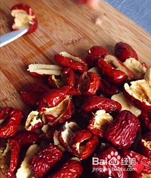将红枣放入料理机中,倒入少许牛奶,打成红枣泥。