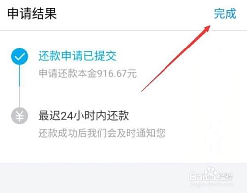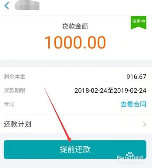 进入后即可看到此笔记账的详情,可查看当时所签订的规则,及每一期的还款数目等。最下方有提前进行还清的选项,点击进入下一步。需注意,要想清楚,这次要还多少,还的部分从今天起不再生息,此时要保证对应账户余额有足够数目金额,再进行下一步操作。