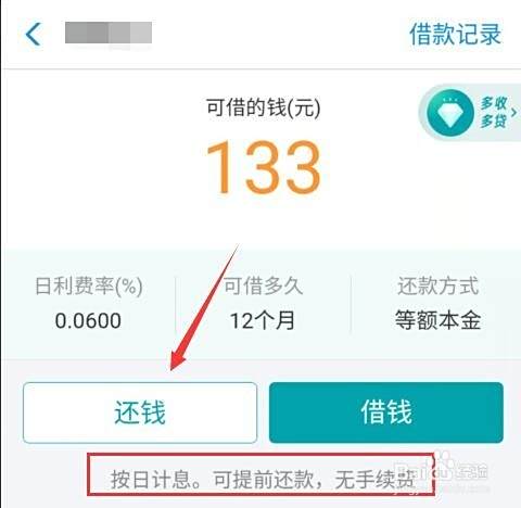 这里已经借过钱,现在准备提前全部付清,也可支付部分。进入后,可看到当前额度剩余等详情,接着点击“还钱”。