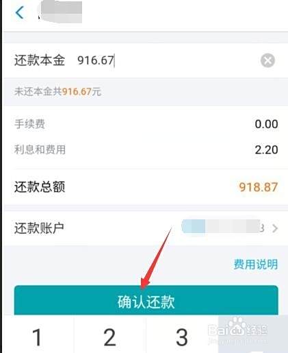 进入信息输入界面,输入小于或者最大可还金额,下方会计算出距上次还款,过去的这几天,增长的利息后,再加到输入的金额上,点击确定,进入下一步。