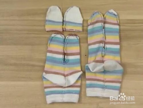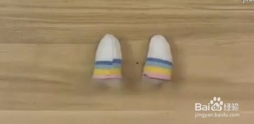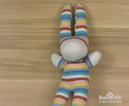第三,用针线把耳朵和手缝起来,然后把棉花分别塞进两个小手和袜子里去,注意要塞得满满的才好看。如图