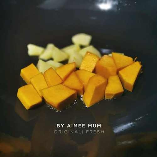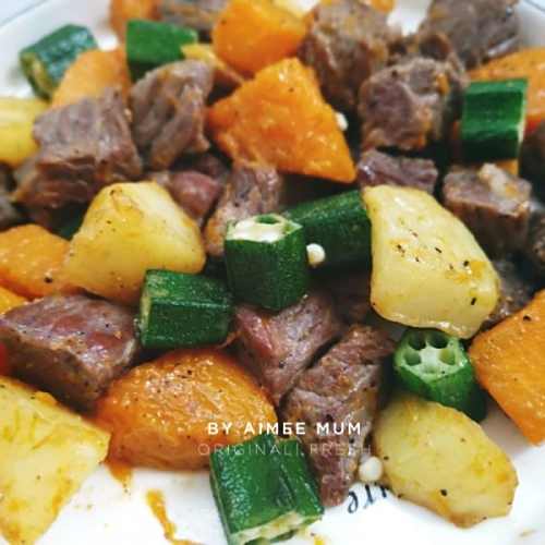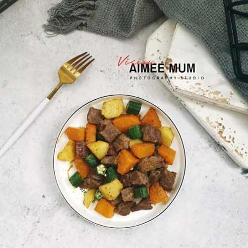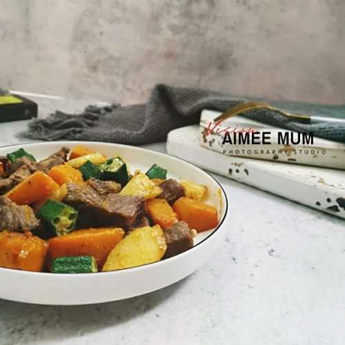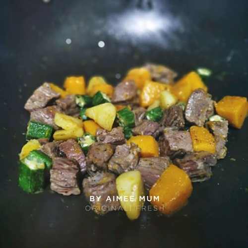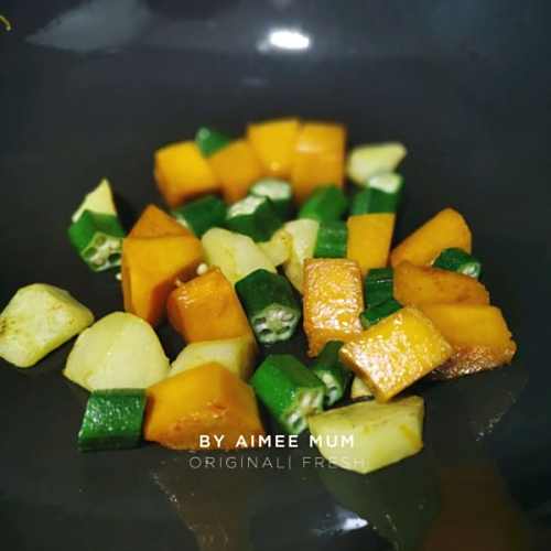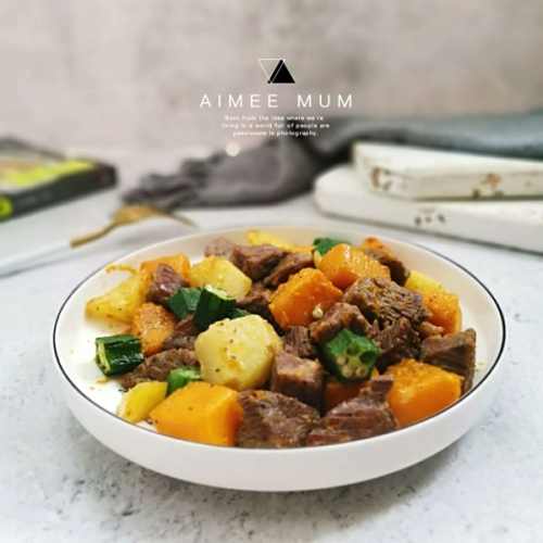 3待土豆五成熟时,加入南瓜,翻炒至8成熟,最后加秋葵翻炒,加少少许水(真的只要一点,别太多哦)再焖1分钟即可(因为用的钛合金锅导热快,所以普通炒锅视情况而定)),撕适量盐,胡椒粉装盘待用