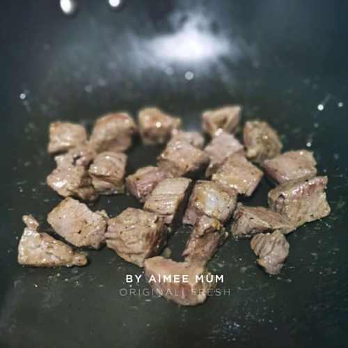 1将牛肉切粒,加入适量的黑胡椒腌制30分钟