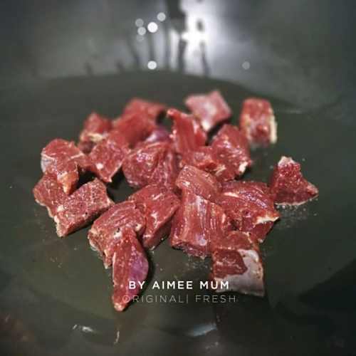 4倒入适量的油,将牛肉粒倒入锅内,中小火煎至牛肉开始变色,稍微晃动锅,再用铲子快速翻炒至9成熟,撒适量的盐