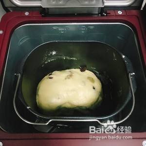 面包桶放入面包机卡紧,盖盖后选择功能19,进行1次和面程序(18分钟)。之后把蔓越莓干,葡萄干,核桃碎等装满投料盒盖好。但果料也不能过多啊,会把面包压塌的
