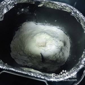既然是懒人版,称重和材料准备合二为一!面包桶放秤上,材料重量累加即可。第一步倒入温奶110g,打入鸡蛋1个,白砂糖30g倒入面包桶一角,食盐3g倒入白糖对角;第二步倒入高筋面粉250g,倒入奶粉25g,面粉中间挖小洞倒入干酵母3g,隔离干酵母和液体材料~准备完毕