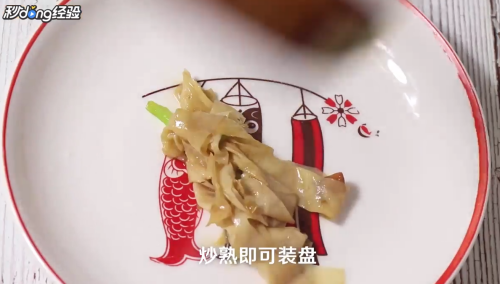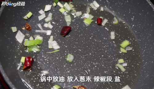 锅中倒油,放入葱末、辣椒段、盐、青椒、干豆皮、酱油翻炒。