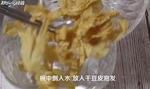 碗中倒入水,放入干豆皮泡发,青椒切丝备用。