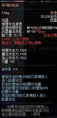 梁月的钝剑装备等级:85。武器类型:钝器缓慢攻击速度物理攻击力+929魔法攻击力+788独立攻击力+522力量+86命中率+1%,破招攻击时有30%的几率使敌人进入眩晕状态反击时增加20%的额外伤害,攻击眩晕状态的敌人时增加30%的额外伤害攻击时有2%的几率使敌人进入眩晕状态。这个武器无疑就是剑魂用的。