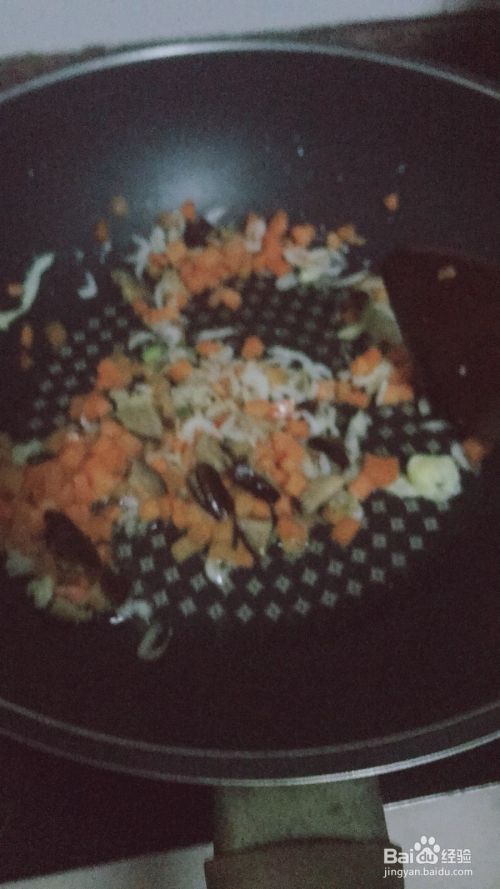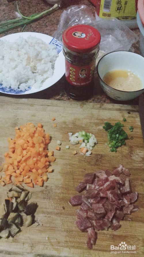 准备材料:米饭、牛肉、鸡蛋、老干妈、胡萝卜、香葱;