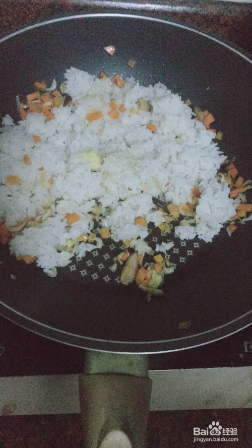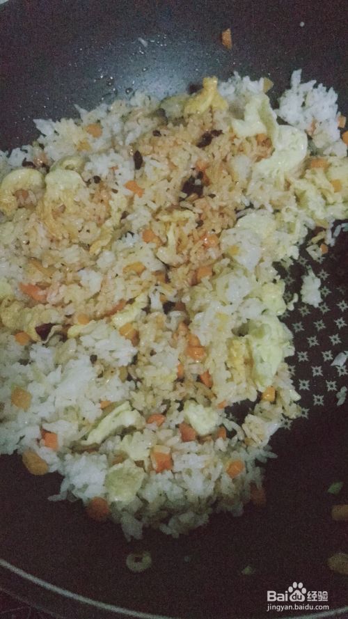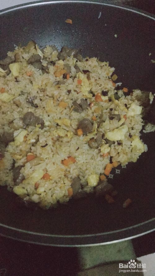 加入米饭,翻炒一下,炒到米饭散开,加入炒好的鸡蛋和牛肉粒、老干妈继续翻炒,调味炒均匀即可出锅;