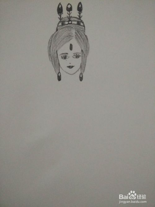 首先我们用铅笔在画纸上画出孔雀公主的脸蛋及五官,眉毛细细的,眼睛大大的带有长长的睫毛,眼睛要留出高亮部分,眉心画上水滴形的装饰。