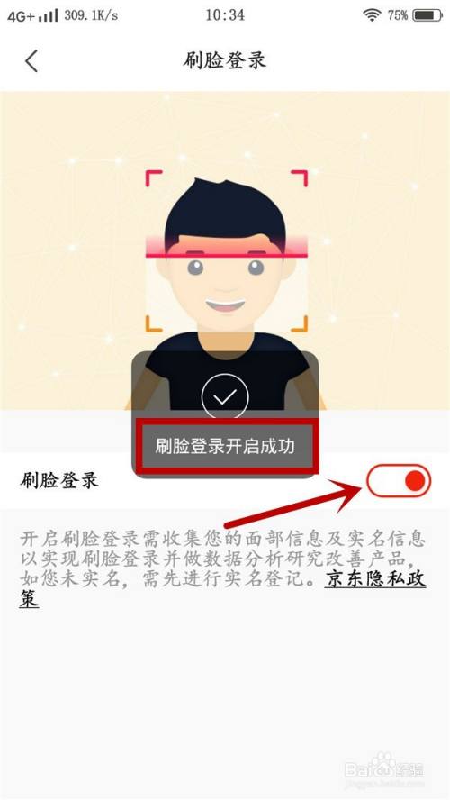 页面提示:刷脸登录开启成功,【刷脸登录】后的按钮呈红色即可。