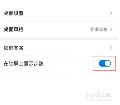 在桌面和壁纸界面,打开在锁屏上显示步数开关即可。