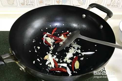 然后锅中留下少量的油,油温四成热的时候加入准备好的葱姜蒜末,辣椒丝下锅翻炒出香味,