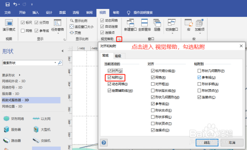 visio拖入连接线到图形上无法显示绿框自动粘附,这可能是未勾选自动黏附。
